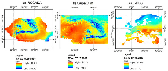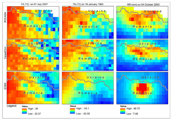 The first analysis was performed considering the historical TX and TN values, as well as the highest daily amount of precipitation recorded at the Ocna Șugatag weather station. For the spatial distribution of TX, some anomalies can be observed within the ROCADA and CARPATCLIM gridded datasets (Figure 3). Large temperature differences were detected from one cell to another. Since it is not usual to have such steep differences, we suppose that the methodology of data interpolation could explain this, because the ROCADA and CARPATCLIM datasets used the same method for data homogenization (MASH) and interpolation (MISH) [24,26,27,28], and both datasets have the same distribution anomalies, therefore, it can be assumed that the problem lies in the procedure (method) used for spatial interpolation.