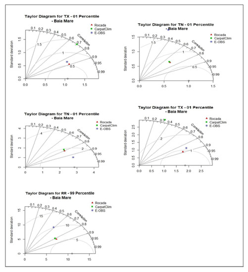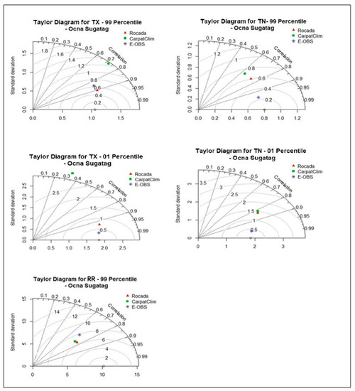 Using Taylor charts for historical extreme values allowed us to identify the position of gridded data as compared with the reference data. For the 99th percentile (for maximum values), the ROCADA database is generally in a better (closer) position, and for the 1st percentile (for minimum values) the data from E-OBS are more accurate. This was surprising, because to obtain the E-OBS gridded dataset, a lower density of weather stations was used than in the case of the ROCADA and CARPATCLIM databases. It was expected that the ROCADA database, which was developed based on the highest density of weather stations, would better capture the extreme values.