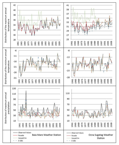 Following the methodology described, we performed a specific analysis for all datasets. A very good correlation (higher than 0.95) was obtained for all databases. Pearson’s correlation coefficient indicates different situations for the two meteorological stations. The comparison between the three gridded datasets and the observation values at the Baia Mare meteorological station revealed the best results for ROCADA dataset, while comparing them with the values observed at the Ocna Șugatag meteorological station, the higher correlation coefficient was obtained for the E-OBS dataset (Table 4).