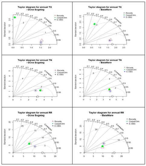 Taylor diagrams for the extreme annual values (TX, TN, and RR) over the period 1961–2010 at the Ocna Șugatag and Baia Mare weather stations.