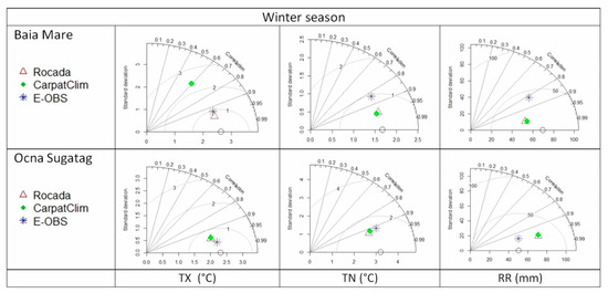 Taylor diagram-based method was employed for seasonal datasets, too. The analysis revealed a slightly more complicated situation compared to that obtained for the complete datasets: the values of statistical indicators derived from ROCADA datasets, both for winter (Figure 8) and summer (Figure 9) were found to have the best correlation with the statistical indicators of the observation dataset for the Baia Mare weather station and those derived from E-OBS database for the Ocna Șugatag weather station.