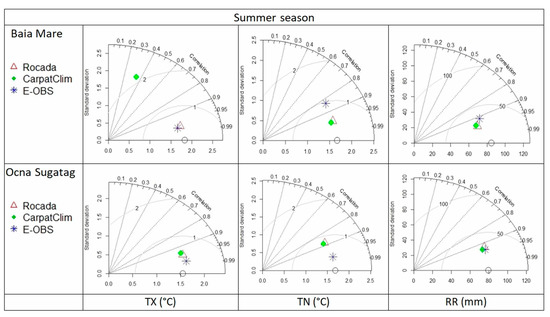 Taylor diagrams for summer (TX, TN, and RR) at the Ocna Șugatag and Baia Mare weather stations (1961–2010).