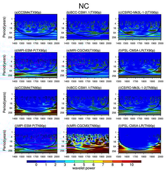 Wavelet analyses of TX90p and TN90p in NC from 1400–2005 CE. (a–f) Simulated TX90p by six models. (g–l) Simulated TN90p by six models. The shaded area shows the periods with confidence levels higher than 95% and the cone of influence is shown as the black line.
