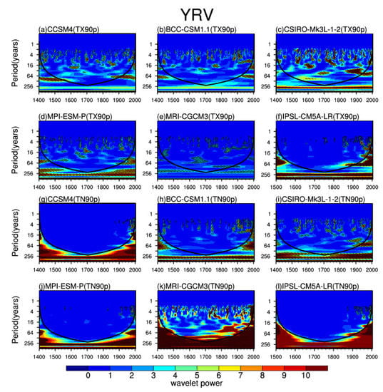 In YRV, the wavelet analyses of TN90p and TX90p suggested a shift since the mid-19th century (as indicated by a change in TN90p from a 128-year to a 32–64-year period around the mid-19th century simulated with MRI-CGCM3 in Figure 6k), a 32–64-year period in TN90p from the mid-19th century simulated with CSIRO-Mk3L-1–2 in Figure 6i, a 64-year period in TN90p around the mid-19th century simulated with IPSL-CM5A-LR in Figure 6l, a 64-year period in TX90p simulated with CCSM4 and IPSL-CM5A-LR in Figure 6a,f and a strengthened ~32-year period in TX90p simulated with CSIRO-Mk3L-1–2 in Figure 6c from around 1850 CE.