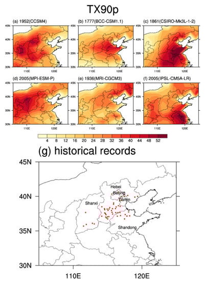 Mismatches appeared not only in the time series but also in the spatial distributions of extreme warm events. During the last 700 years, 1743 CE was the hottest year in NC [30]. There are 52 records (the largest number of records in Table 2) found in the historical documents. These records describe that the extreme hotness occurred in the Beijing, Tianjin, Hebei, Shanxi and Shandong provinces [30]. A conversion from the temperature measurements using a Réaumur-scale thermometer showed that the daily temperature reached 44.4 °C in Beijing in 1743 CE [30]. However, many models could not simulate this extreme warm event well (Figure 7). It seemed that BCC-CSM1.1 reproduced the best simulations relative to the other five models. The BCC-CSM1.1 modelled TX90p field (Figure 7b) for 1777 CE generally agreed with the documented distribution of this warm event (Figure 7g) from historical documents.