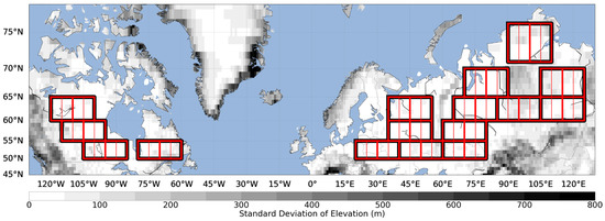 and are compared against each other at 20° × 5°, 10° × 5°, and 5° × 5° spatial resolutions, with the 10° × 5° and 5° × 5° nested inside of larger 20° × 5° grid cells, at 10-day, 20-day, and 30-day time periods. We draw comparison grid cells over relatively flat regions to prevent SWE and CloudSat errors that are linked with complex topography (Figure 1). In all of these regions, the average surface clutter within the range gates that determine CloudSat-retrieved surface snowfall rates are negligible.
