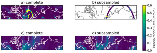 Figure depicting the formation of monthly estimates of global precipitation through complete (a,c) and subsampled (b,d) CFDDA reanalysis. Subplots (a,b) represent a single hour, subplots (c,d) represents the average of all hours in a month.
