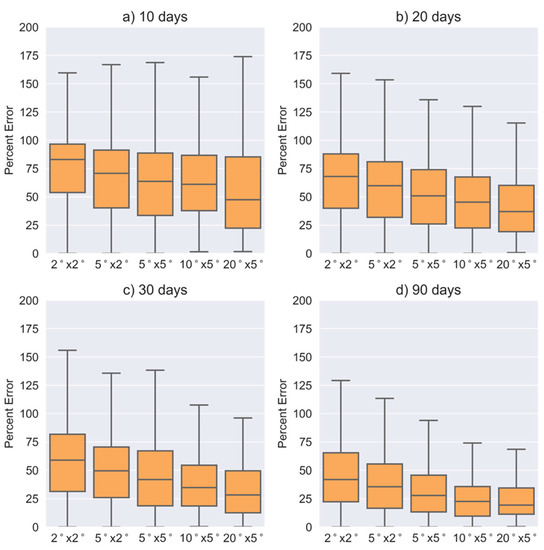 On seasonal time scales, is predicted to have median near 50% at the smallest spatial scale of 2° × 2°, and near 20% at the largest spatial scale of 20° × 5°. On monthly time scales, estimated median are still near 50% at spatial scales as small as 5° × 2°. These estimates are not weighted by sampling frequency, so they are likely larger or smaller depending on latitude. Whisker ranges are typically several times larger between the 75th and 95th percentiles than the 5th and 25th percentile, indicating again that errors may often be considerable even if median errors are relatively low. The overall picture is that theoretical accuracy improves, and the variation of errors decreases, with increasing spatial and temporal scale.