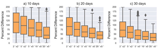 As in Figure 3, but with for 10 (a), 20 (b), and 30 (c) day time periods. Fliers (measurements beyond the whisker range) are visualized.
