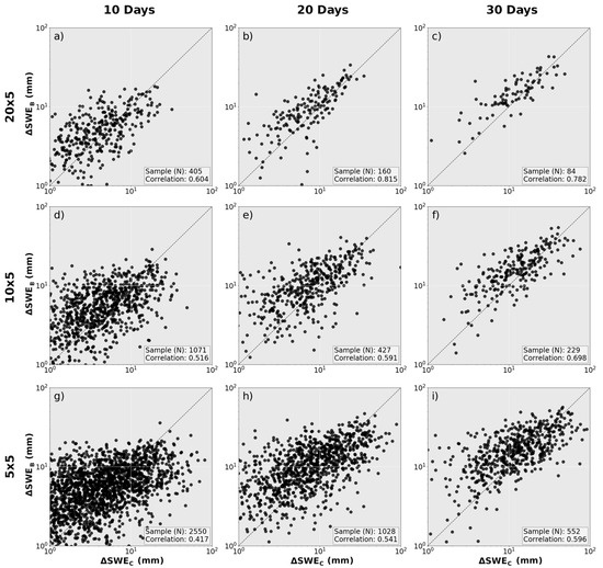 We evaluate our predicted CloudSat accuracy by comparing collocated ∆SWEC with . Evaluations are presented at all combinations of 5° × 5°, 10° × 5°, and 20° × 5° and 10-day, 20-day, and 30-day resolutions in Figure 5. can vary by two orders of magnitude and the differences between and are heteroscedastic, so results are presented on a log-log scale. There is a visible agreement between the two measurements of in all panels, though the correlation decreases with finer space and time resolutions. The strongest correlation coefficient of 0.8 occurs for 20° × 5° grid cells on 20 and 30 day time periods. The next highest correlation coefficient (0.7) comes for 10° × 5° grid cells on 30 day time periods. The lowest observed correlation coefficient is 0.4 at 5° × 5° grid cells over 10 day time periods.
