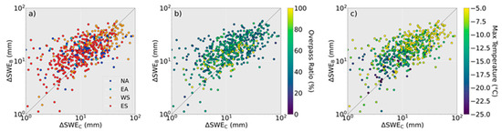 Collocated measurements for 10° × 5° grid cells at one month resolution, as in Figure 5, but colored with respect to region (a), overpass ratio (b), and maximum temperature (c).