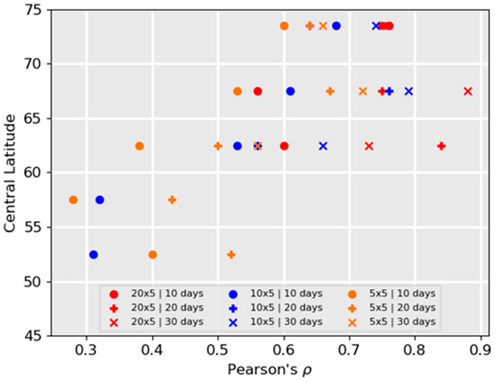 The correlation coefficients paint an expected picture: correlation increases with decreasing spatiotemporal resolution and higher latitudes. Of course, the two are not totally independent, since grid cells will decrease in physical area with increasing area. Note that there are great variations in the number of measurements and range of within datasets, and while data are only presented if they provide a p-value less than 0.01, these differences likely still influence the results for data subsets with particularly low volumes. Additionally, note that the different latitudes represent different numbers of grid cells that are providing data. The 70–75° N grid is entirely comprised of one 20° × 5° cell in northern Siberia (Figure 1) and there were no 20° × 5° grid cells that provided consistently freezing time periods below 60° N. Figure 7 does demonstrate, however, that the results from Figure 5 are likely more intricate than they appear. The 5° × 5° data 10-day data, which has the most data points and can be expected to be the most statistically robust measurement at all central latitudes, has a stronger correlation at 75° N than any represented dataset (5 × 5° 10 days, 10° × 5° 10 days, 5° × 5° to days) below 60° N, for example. Therefore, one can expect higher accuracy for finer spatiotemporal resolutions closer to the poles [38].