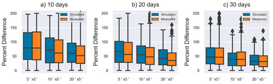with and here representing the full and subsampled grid cells from Figure 2c,d, respectively. Box plots of predicted distributions are provided in Figure 4. The 90-day distributions are not calculated since there are no 90-day frozen time periods that can be used to generate cells for evaluation. As an example, if a CloudSat measurement could retrieve a snowfall accumulation of 20 mm with a median percent difference error of 50%, the true snow accumulation would be between 12 and 33 mm half of the time.