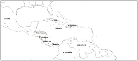 Figure 1 shows the Intra-America Seas, including the Caribbean, Central America and northern South America. Subsequent analyses are restricted to the Caribbean, which for the study is defined as the geographical region bounded by latitudes 5° N to 25° N and longitudes 60° W to 90° W. This definition is similar to that utilized in past studies of the region—for example, ref. [,,].