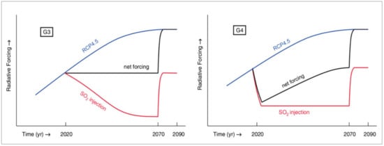 Geoengineering Model Intercomparison Project (GeoMIP) scenarios. The G3 experiment is configured to approximately balance positive radiative forcing from representative concentration pathway 4.5 (RCP4.5) by injecting SO2 into the tropical lower stratosphere. The G4 experiment produces immediate negative radiative forcing by injecting SO2 into the tropical lower stratosphere at a rate of 5 Tg per year. Adapted from [].