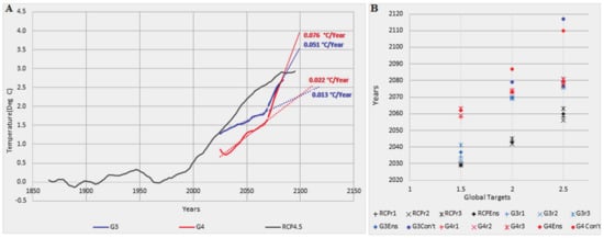 (A): World temperature anomaly (with respect to 1860 to 1900) for ensemble mean of HadGEM2-ES_unaltered runs under RCP4.5 (solid black line) and HadGEM2-ES under G3 (solid blue line) and G4 (solid red line) conditions. Shown as well are the trend lines and the corresponding rates of temperature increase if SRM is continued onward from 2070 (dotted lines) and for the sharp rise in temperature that is projected after SRM is discontinued in 2070 (solid thin lines). (B): Years when global average temperatures are expected to reach 1.5, 2.0 and 2.5 °C for unaltered and SRM-altered HadGEM2-ES. Results are for three realizations and the ensemble mean. Shown also are the years when G3 and G4 HadGEM2-ES (G3_Con’t and G4_Con’t) reach 2.0 and 2.5 °C if SRM is continued after 2017.