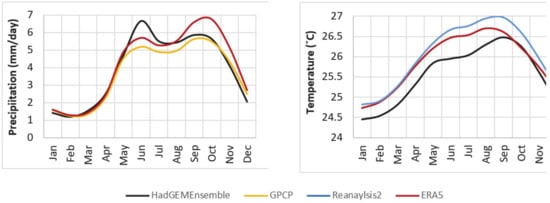 Monthly climatology plots of precipitation (right) and air temperature (left) for the Caribbean from HadGEM2-ES (black), GPCP (yellow), Reanalysis2 (blue) and ERA 5 (red) datasets. Averaging period is 1985 to 2005.