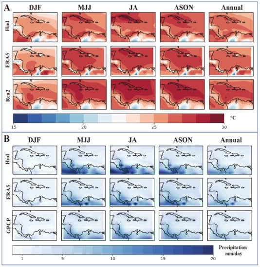 Figure 5 depicts the mean annual and seasonal maps of air temperature (panel A) and precipitation (panel B) for the Caribbean region covering the period 1985 to 2005. The figure helps explain some of the biases seen in Figure 4.