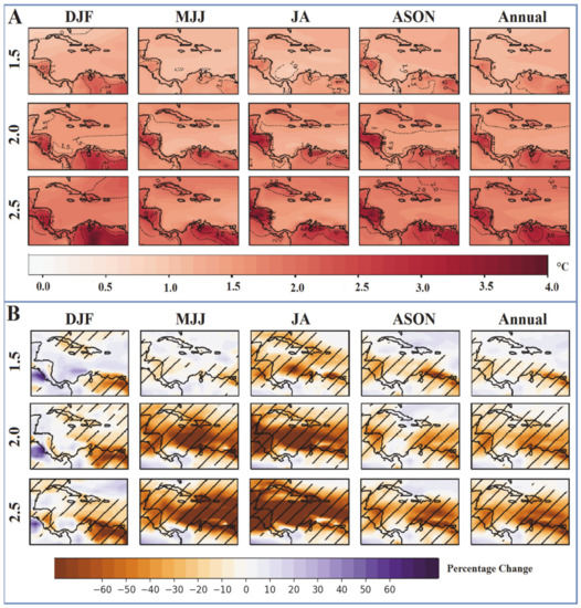 - The pre-industrial minus HadGEM_unaltered precipitation plot (hatched black bars) shows mixed monthly tendencies in Caribbean precipitation at the 1.5 °C LTTG (row 2, column 2). During the pre-industrial period, January–February and July–September are between 5 and 11% wetter, while the other months are either minimally or up to 9% drier than at 1.5 °C. Otherwise stated, the months January, February, July, August and September become wetter at 1.5 °C, and the other months, including the peak rainy of season months, show small changes or are slightly drier. At 2.0 °C, however, a dominant pattern emerges, with January to September during the pre-industrial period being wetter (or the mean Caribbean during these months being drier at 2.0 °C) by up to 17%. The 2.0 °C pattern is mirrored for 2.5 °C with identical months showing identical tendencies, but with the peak change in March and July exceeding 20%. It is noted that Figure 6 suggests a similar region-wide onset of predominantly dry conditions above the LTTG of 1.5 °C which is maintained or slightly intensified for the higher LTTG. Reference [] also made a similar observation.