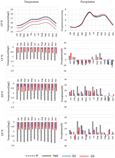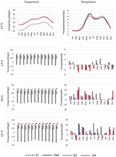 - Compared to HadGEM_unaltered, monthly G3 (G4) changes in precipitation range between −13 and 4% (−9 to 12%) for 1.5 °C. Except in November, G4 shares the same tendency as for the pre-industrial period; i.e., January–February and July–September are wetter than HadGEM_unaltered at 1.5 °C, while the other months are either minimally or up to 12% drier. In comparison, G3 is always drier than HadGEM_unaltered except during September. Note, then, that there is less precipitation during the two rainfall peak months (June and October) due to SRM (G3 and G4) than if it were not applied. In comparison, for the 2.0 °C years, monthly G3 (G4) precipitation differences range between −7 and 9% (−1 to 10%), while for the 2.5 °C years the differences range between −3 and 16% (−9 to 12%). At these higher warming targets, there is a pattern for more rainfall (or less drying) from January through November under SRM (exceptions are G4 in February and G3 in October at 2.0 °C, and G4 in February and October and both G3 and G4 in May at 2.5 °C), though the change is never enough to restore rainfall to the level simulated during the pre-industrial period. Under this pattern, however, unlike at 1.5 °C, there is more rain in June for both the 2.0 and 2.5 °C years compared to the unaltered climate.