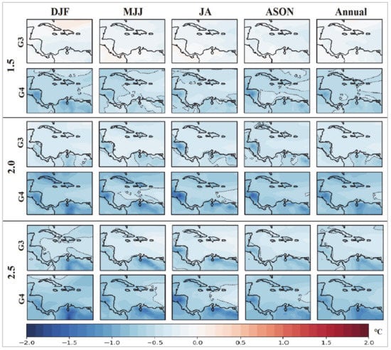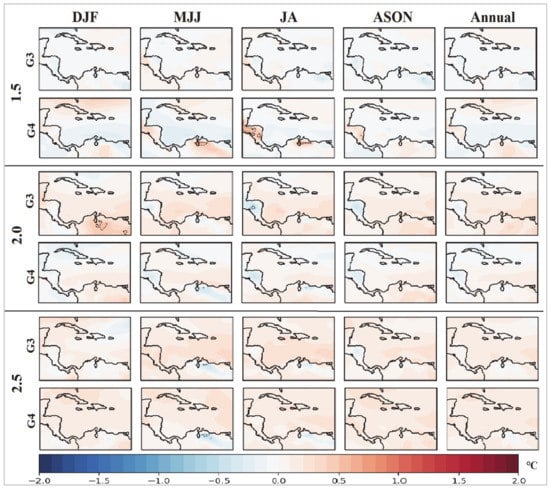 As already noted, with respect to HadGEM_unaltered, changes in temperature across the domain are small (less than ±0.2 °C) at each of the temperature LTTGs. Notwithstanding, parts of the Caribbean exhibit slightly cooler or warmer tendencies compared to HadGEM_unaltered depending on the SRM experiment. For example, at 1.5 °C in the annual mean, whereas both G3 and G4 result in the far north of the domain (Central Caribbean Sea) being slightly warmer (cooler) than HadGEM_unaltered, the two methodologies differ with respect to Central and northern South America with G3 (G4), indicating slightly cooler (warmer) conditions than the SRM unaltered world. Opposite tendencies are particularly noticeable over Honduras and Nicaragua across all seasons and over northern Venezuela in JA and ASON. At 2.0 °C, for the annual mean, G3 and G4 similarly project the Central Caribbean Sea and northern South America (Honduras and Nicaragua) as slightly warmer (cooler) than HadGEM_unaltered; however, for G3 the warm tendency extends further north to include the Greater Antilles except central Cuba. At 2.5 °C, the annual mean indicates the entire domain as slightly warmer than HadGEM_unaltered, except over parts of northern South America, irrespective of the methodology.