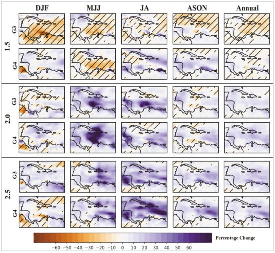 Per annum and for all the defined seasons, the main Caribbean basin becomes increasingly drier for successively higher temperature LTTGs. At 1.5 °C drying is already present in the south and south-eastern Caribbean for the annual mean and across all seasons. In contrast, the north Caribbean shows slightly wetter conditions (though not statistically significant) except in the two dry seasons (DJF and JA). The area of significant drying increases northward and westward for 2.0 and 2.5 °C, representing a reversal of conditions in the north Caribbean and an intensification in the southern Caribbean. The smallest decreases in precipitation are observed in the winter months and there is a rainfall maximum over the Pacific side of Central America. The largest decreases in precipitation are observed in JA for 1.5 °C (≈40%) and in MJJ and JA (>60%) for the 2.0 and 2.5 °C years. It is noteworthy that whereas the half a degree transition from 1.5 °C to 2.0 °C is characterized by an intensification and even a reversal of trend from wetter to drier for the Caribbean, the half a degree transition from 2.0 to 2.5 °C does not proportionately alter the coverage and magnitude of the drying, which are similar for the two higher LTTGs. Reference [] reports similar findings for changes in Caribbean rainfall patterns for the three temperature LTTGs.