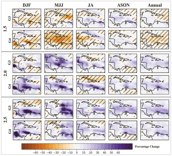 The Caribbean is drier under G3 at 1.5 °C (Figure 9) compared to the SRM unaltered world. Except for western Cuba the main Caribbean basin is 10–20% drier in DJF, MJJ and in the annual, with a similar drier tendency in the west and east Caribbean in JA and the north and east Caribbean in ASON. In comparison, under G4, drier regions are much smaller in extent though generally similarly located in the annual and ASON maps; restricted to the south and west Caribbean Sea respectively in MJJ and JA, and almost non-existent in DJF. At 2.0 °C and 2.5 °C, for both G3 and G4, the region exhibits mostly wetter conditions than HadGEM_unaltered (e.g., see the annual maps), with greatest change in the main Caribbean basin during the early rainfall season (MJJ) and the mid-summer drought (JA). Notwithstanding, varying parts of the region are drier than HadGEM_unaltered during DJF and ASON.