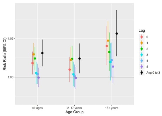 There are notable differences in the timing in regards to when significant effects are occurring between the two age groups. The most extreme examples are presented in Figure 4 and shown in more detail in Table 3. At the population-level, adults showed significant associations with adverse respiratory health outcomes more immediately following exposure (i.e., lag days 0–2) but not at later lag periods (i.e., lag days 3–5). The opposite was true for children, who continued to experience adverse health impacts of exposure to elevated levels of air pollution 3–5 days following exposure. However, the lack of positive associations among children at lag days 0–2 should be interpreted with caution given that the non-significant association is driven entirely by a lack of effect observed at lag day 0, a finding that was also consistently observed in the individual pollutant results. These values were specifically selected to show the most dramatic differences in effects observed by age group. Other groupings of lag days (e.g., lag days 1–3, etc.) show significant associations for population-level health risks among both children and adults with similar magnitudes of relative risks (t-statistic for children at lag days 1–3 = 2.55, t-statistic for adults = 2.49).