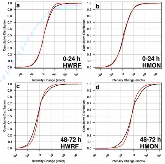 0-24 h (a) HWRF and (b) HMON maximum wind speed change CDFs based on retrospective forecasts from the 2014–2016 cases (red line). The black line denotes the corresponding best track maximum wind speed change CDF. (c,d), as in (a,b), but for the 48–72 h forecasts.