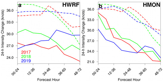 (a) HWRF 95th percentile 24-h TC maximum wind speed changes (solid line) based on retrospective forecasts prior to the 2017 (red), 2018 (green) and 2019 (blue) seasons as a function of forecast lead time. The dashed lines indicate the corresponding best track TC maximum wind speed changes for those years. (b) as in (a), but for the HMON model.