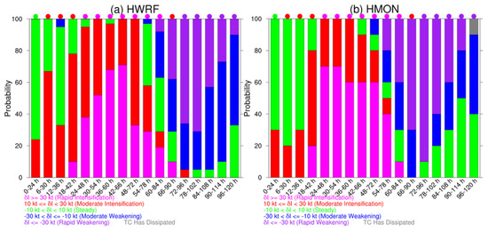 Stacked bar chart of the probability of the change in Hurricane Harvey’s maximum wind speed as a function of lead time based on the (a) HWRF and (b) HMON ensemble initialized 1200 UTC 22 August 2017. The colored dots along the top of the figure denote the verifying change in Harvey’s maximum wind speed based on best track data.