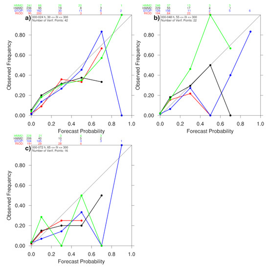 Reliability diagrams for (a) 0–24 h TC maximum wind speed change >= 30 knots, (b) 0–48 h TC maximum wind speed change >= 55 kts, and (c) 0–72 h TC maximum wind speed change >= 65 knots for interpolated HWRF ensemble (HWM2; black), interpolated HMON ensemble (HMM2; green), SHIPS Rapid Intensification Index (RIOD; red), and DTOPS (DTOP; blue) models during 2017–2019. The number of cases within each category is given along the top of each figure.