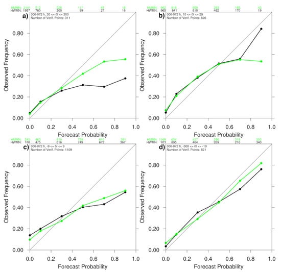 HWRF (black) and HMON ensemble (green) reliability diagrams for 24-h TC maximum wind speed change (a) >= 30 knots, (b) 10 <= I < 30 kts, (c) −10 < I < 10 kts, and (d) I <= −10 kts during each 24 h period from 0 to 24 h to 48–72 h during 2017–2019. The number of cases within each category is given along the top of each figure.