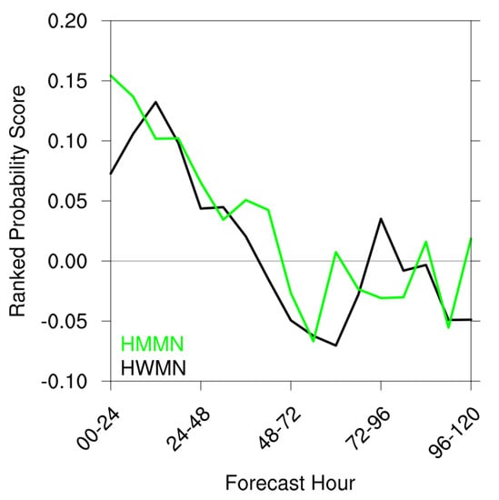 The previous results suggest that both the HWRF and HMON models have varying ability to provide useful probabilistic guidance on the correct intensity change category. One way to evaluate this is to compute rank probability skill score (RPSS; [38]) as a function of forecast period. RPSS is defined as