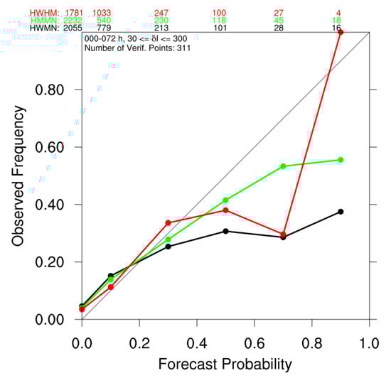 The relative infrequency of RI can make it difficult to assess whether these models can provide useful probabilistic guidance. One way to increase the number of potential cases is to consider multiple 24 h periods simultaneously, namely from 0 to 24 h to 48–72 h, which in turn yields 9 potential verification times for each individual forecast. Figure 5a shows the RI reliability diagram for all 24 h periods from 0 to 24 to 48–72 h into the forecast, which yields 311 RI “events”. Similar to Figure 4a, both the HWRF and HMON ensembles are characterized by forecast probabilities that are lower than the observed frequency when the forecast probability is below 20%, while the ensemble-based forecast probabilities are higher than the observed frequency when the forecast probability exceeds 50%, with the HMON forecast closer to the 1:1 line. In turn, the HMON BSS is 0.14, compared to 0.01 for the HWRF system. As a consequence, it appears that the HMON ensemble-based probabilities are more skillful forecasts of RI relative to the HWRF ensemble.