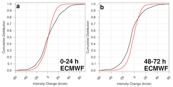 0-24 h ECMWF maximum wind speed change CDFs based on retrospective forecasts from the 2017–2018 seasons (red line). The black line denotes the corresponding best track maximum wind speed change CDF. (b) as in (a), but for the 48–72 h forecasts.