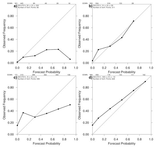 ECMWF ensemble reliability diagrams for a 24 h TC maximum wind speed change (a) >=30 knots, (b) 10 <= I < 30 kts, (c) −10 < I < 10 kts, and (d) I <= −10 kts for each 24 h period from0 to 24 h to 48–72 h for all Atlantic and Eastern Pacific cases during 2019. The number of cases within each category is given along the top of each figure.