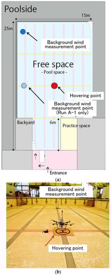 Propeller downwash can affect drone-mounted anemometer measurements, but indoor experiments and simulations have shown that mounting the sensor on the upper center of the drone reduces its impact [20,21,22,23]. Accordingly, the anemometer used in this study was equipped on the upper center of the fuselage; however, our previous research identified a wind speed bias of +0.5 m·s−1 when compared with observations from a meteorological tower [2]. Since this bias was attributed to the downwash effect, a preliminary experiment was conducted in an indoor field under still conditions. The test site was a drained, indoor swimming pool, with a flight space of 5 m × 25 m × 15 m (h × l × w) (Figure 2). The roof was composed of a plastic fiber material such that the GPS signal, indispensable for stable drone flight, could still be received. The anemometer-equipped drone was deployed from the center of the test site. To capture the background wind caused by a drone flight, an anemometer (WXT510; Vaisala, Finland) was installed at a height of 2 m (Figure 2b), and the wind speed was recorded at 1-min intervals. The background wind measurement point was replaced after the first run (Run A-1) to avoid a collision accident with a drone. The drone was hovered for 5-min at heights of 2 m and 3.5 m during each run, and a 5-min waiting time was imposed between flights to confirm that the stable, still conditions returned under the static state. The wind speed data measured by the drone were logged at 1-s intervals and analyzed.