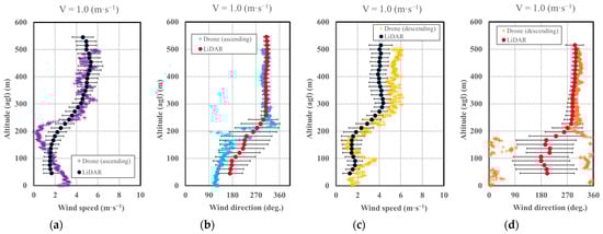 Comparison of vertically moving drone and LiDAR observations: (a–d) V = 1.0 m·s−1; (e–h) V = 3.0 m·s−1; (a,c,e,g) wind speed; (b,d,f,h) wind direction; (a,b,e,f) with ascending drone; and (c,d,g,h) with descending drone for Runs B-1 and B-3. The error bars represent the standard deviation of LiDAR measurements during the ascending and descending time periods of the drone.