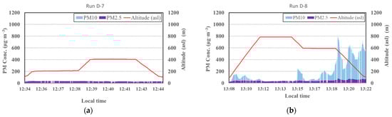 Two explosions occurred during drone observation on 27 February 2020. It was possible to visually identify the behavior of an intermittent plume and ash fall passing over the observation site (Photo S1 in Supplementary Materials). Figure 10 shows the time series variations for PM concentrations during each run on 27 February 2020, where Runs D-7 to D-10 were conducted under Protocol A and Runs D-11 and D-12 were conducted under Protocol B. Run D-7 was conducted before the explosions, and it confirmed that the PM concentrations were initially as low as the background levels (Figure 10a). In contrast, peak concentrations appeared after Run D-8 (Figure 10b–f) and were tens of times higher than the background levels, reaching the maximum detection limit of the PM sensor (>1000 µg·m−3). However, maximum PM concentration levels were measured at several different instances after the explosions; these levels subsided within a few minutes, even at the same altitude. A primary driver of this sporadic pattern observed is the uneven output rate of the volcanic eruption, which is normal for the Sakurajima crater [25]. Another possible reason was the unstable wind around the volcano, which altered the direction of the plume every minute or so. An additional, notable finding was that, at peak levels, the increase in PM10 concentration was greater than that in PM2.5 concentration, implying that the contribution of coarse particles was dominant in the volcanic ash plumes. This feature has also been reported in a previous volcanic survey on Sakurajima, for which a manned airplane was employed [26].