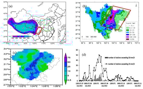 For the rainstorms in the western SCB during 7–11 July 2013, the duration lasted up to four days, the number of AWSs recording 400–999.9 mm (Figure 1a) exceeded 100, and the number of stations recording ≥250 mm reached 184, with a maximum value of 1108.1 mm, which occurred at Xingfu town, Dujiangyan. From the evolution of the number of AWSs recording ≧25 mm/h and ≧50 mm/h (Figure 1b), the precipitation efficiency of the whole process was relatively high. Among them, the precipitation rate of ≧25 mm/h ran throughout the whole process and that of ≧50 mm/h was mainly concentrated in two stages (1200 UTC 7 July to 0600 UTC 8 July (the first period) and 0700 UTC 8 July to 0600 UTC 9 July (the second period)). These rainfall rates showed extreme characteristics, with the range of the second period being larger and the duration longer. Extreme hourly precipitation was mainly concentrated in the western SCB (Figure 1c). From 0600 UTC 9 July, the hourly precipitation weakened, but it continued to rain in the west of the basin. As of 1200 UTC, the cumulative maximum rainfall in this period (called the third period) exceeded 400 mm. Therefore, it was a significant extreme feature where the hourly precipitation reached rainstorm level and lasted for more than 12 h in the rainstorm. The entire precipitation process featured large cumulative rainfall and the total rainfall of one station exceeded 1000 mm, breaking the historical observation record, which was also a significant extreme feature.