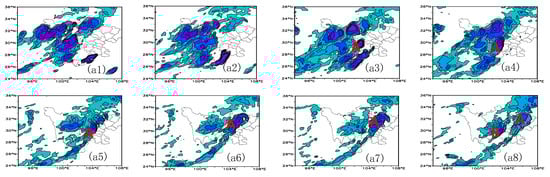 In fact, the formation processes of a rainstorm are complex, for example, the large scale conditions, the quantity of water vapor, the strong upward motion, the level of instability in the atmospheric stratification, together with the effects of weather systems and topographies at multiple scales, all act in a synergistic way in the occurrence of severe rainstorm weather []. The MCSs are usually the direct systems of the associated rainstorms and can be organized in a variety of ways [,,,]. Accordingly, the spatial distribution, intensity, and duration of precipitation processes will differ, and past studies have shown that the organization of MCSs is an important factor affecting their ability to produce rainstorms, particularly the activities of MCSs with a long lifespan [,,].