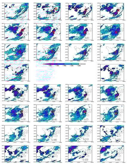 The Tb distribution of the first (a1–a8), second (b1–b14) and third period (c1–c16) in intervals of 2 h: (a1) 1400 UTC 7 July; (a2) 1600 UTC 7 July; (a3) 1800 UTC 7 July; (a4) 2000 UTC 7 July; (a5) 2200 UTC 7 July; (a6) 0000 UTC 8 July; (a7) 0200 UTC 8 July; (a8) 0400 UTC 8 July; (b1) 0600 UTC 8 July; (b2) 0800 UTC 8 July; (b3) 1000 UTC 8 July; (b4) 1200 UTC 8 July; (b5) 1400 UTC 8 July; (b6) 1600 UTC 8 July; (b7) 1800 UTC 8 July; (b8) 2000 UTC 8 July; (b9) 2200 UTC 8 July; (b10) 0000 UTC 9 July; (b11) 0200 UTC 9 July; (b12) 0400 UTC 9 July; (b13) 0600 UTC 9 July; (b14) 0800 UTC 9 July; (c1) 1000 UTC 9 July; (c2) 1200 UTC 9 July; (c3) 1400 UTC 9 July; (c4) 1600 UTC 9 July; (c5) 1800 UTC 9 July; (c6) 2000 UTC 9 July; (c7) 2200 UTC 9 July; (c8) 0000 UTC 10 July; (c9) 0200 UTC 10 July; (c10) 0400 UTC 10 July; (c11) 0600 UTC 10 July; (c12) 0800 UTC 10 July; (c13) 1000 UTC 10 July; (c14) 1200 UTC 10 July; (c15) 1400 UTC 10 July; (c16) 1600 UTC 10 July.