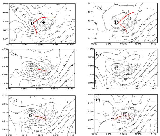 The 700-hPa geopotential height field (gpdam) and wind field (m/s) at (a) 1200 UTC 7 July, (b) 0000 UTC 8 July, (c) 1200 UTC 8 July, (d) 0000 UTC 9 July, (e) 1200 UTC 9 July, and (f) 0000 UTC 10 July. D: the cyclonic vortex, the thick brown line: shear line.