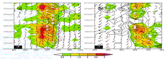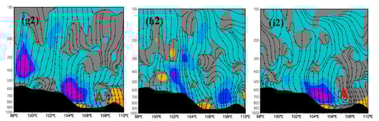 Past studies have shown that gravity waves have a considerable influence on the convective activities of rainstorms [,,]. Leeward slopes of mountain ranges, geostrophic adaptation, and terrain forcing are important mechanisms and sources of wave energy for large-amplitude mesoscale gravity waves, and this is particularly the case for undulating terrain, where the topographical gravity waves interact with the proper airflow, which often causes heavy or increased precipitation. Due to the undulating terrain in the west and north of the SCB (altitude is 500–3000 m in the west and 1000–2500 m in the north), when warm–moist airflow in the low-level interacts with the terrain, it often causes heavy precipitation. In order to analyze the relationship between the terrain gravity wave disturbance in the west and north of the SCB and the low-level airflow, we analyzed the profile of gravity wave stress, the 700-hPa horizontal wind field, and vertical velocity along 104° E and 32° N (Figure 9).