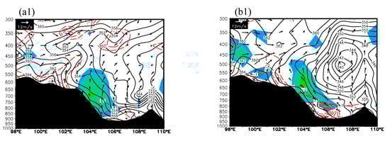 To analyze the dynamic and thermal conditions of rainstorm occurrence, we calculated the physical quantities such as pseudo-equivalent potential temperature () and vertical helicity.  is an important parameter in MCSs analysis, according to Davies-Jones [], and  can be calculated as