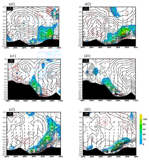 The vertical helicity (shaded, 10−6 Pa/s2), pseudo-equivalent potential temperature (contours, K), negative divergence (red dashed lines, 10−5/s), and horizontal wind (m/s) distribution (a1–d1) vertical section along 32°N; (a2–d2) along 105°E; (a1,a2) 1800 UTC 7 July; (b1,b2) 1800 UTC 8 July; (c1,c2) 1800 UTC 9 July; (d1,d2) 1800 UTC 10 July. Black areas: terrain.