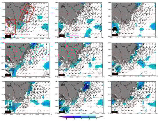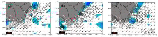Figure 10 shows the surface gravity wave stress (red vectors, N/m2), 700-hPa vertical velocity (contours, 10−1 Pa/s), wind field (wind poles, m/s), and its negative divergence (shaded, 10−5 s−1). Obviously, the leeward east slope (A) and the windward south slope (B) of the plateau terrain are both areas with large gravity wave stress; and under its influence, on one hand, the warm–moist southwestern airflow in the low-level rose up on the south windward slope and caused violent upward movement; whilst on the other hand, the southwestern warm–moist airflow turned to form southeast wind over the southern part of the basin, and formed strong upward movement in the western part of the basin, which provided sufficient dynamic conditions for the occurrence of the rainstorm. In the first stage (Figure 10a–d), the gravity wave stress along the mountain in the western part of the basin reached 2–5 N/m2, the 700-hPa southwest wind changed to southerly wind, and an obvious upward movement (values up to −8 × 10−1 Pa/s) was built along the mountain terrain in the western part of the basin. However, from the perspective of the convergence of the 700-hPa wind field, the negative divergence range was small and mainly located along the mountain in the western part of the basin, and correspondingly, the range of the rainstorm at this stage was also smaller. This shows that strong precipitation basically occurred in the areas with large values of gravity wave stress and obvious vertical upward movement. In the second stage (Figure 10e–h), the mountains along the western part of the SCB and the southeast plateau were areas with obvious gravity wave stress and values up to 2–6 N/m2. At 700 hPa, there was a southeast wind flow over the western part of the basin with wind speeds of 8–12 m/s and its direction was the opposite of the gravity wave stress. This configuration was beneficial to make the terrain gravity waves drag the low-level southeast wind and be uplifted along the mountain in the western part of the basin, forming a more violent vertical upward movement. The vertical velocity center value reached 10–20 × 10−1 Pa/s. In addition, the 700-hPa convergence was further strengthened with values of −2 to −6 × 10−5/s, which provided sufficient water vapor conditions for the intensification of rainstorms. From the statistical observation of precipitation, this stage was indeed stronger than the first stage. For the third stage (Figure 10i–l), the action of topographic gravity waves and the configuration of the low-level wind field were basically the same as in the previous two stages, and resulted in heavy precipitation.