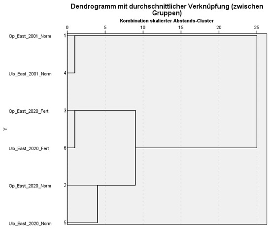 Dendrogram of the similarities between the eastern test plots from 2001 to 2020.