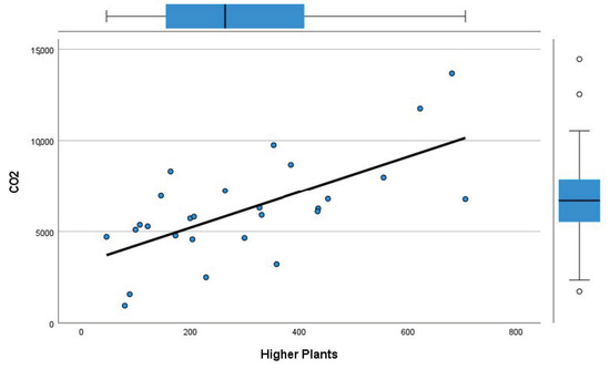 Regression—CO2 fixation dependent on the phytomass of the higher plants from the 27 samples. All numbers are in grams.